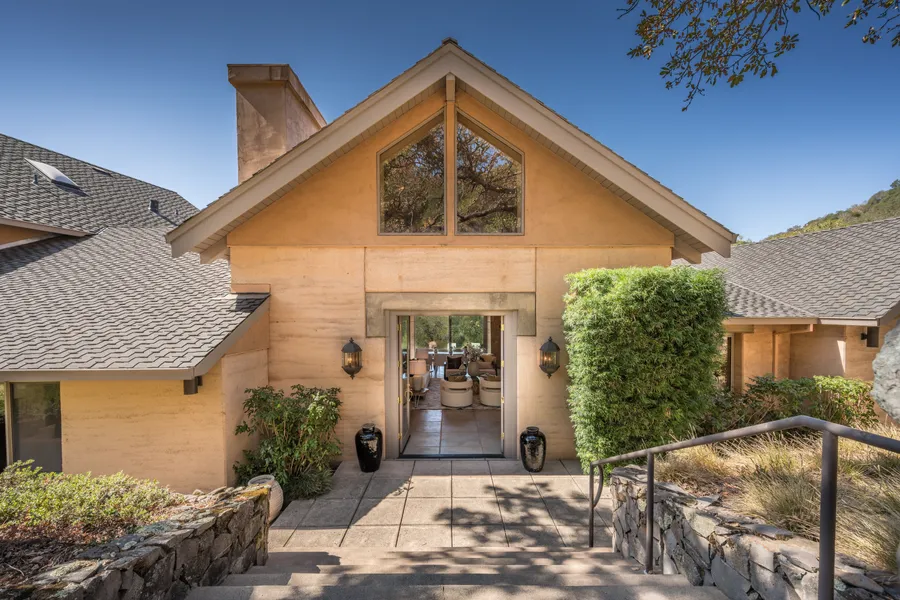 Bright, airy, and only 1.5 mi to the Sonoma Plaza, this home offers 4410sf of grand-scale living space with 4 large bedrooms suites. Stunning views of Sonoma Valley and SF and sustainably built with Rammed Earth construction. The main level consists of a large primary bedroom suite with an office, and generously sized guest suite, High ceilings adorn the great room w abundant light. The family room/kitchen adjoins the great room and includes a powder room & laundry room. Privately situated on the second floor are 2 large additional guest suites. Direct access to outdoor from main level rooms! Outdoor living includes a 40' lap pool with views to San Francisco.