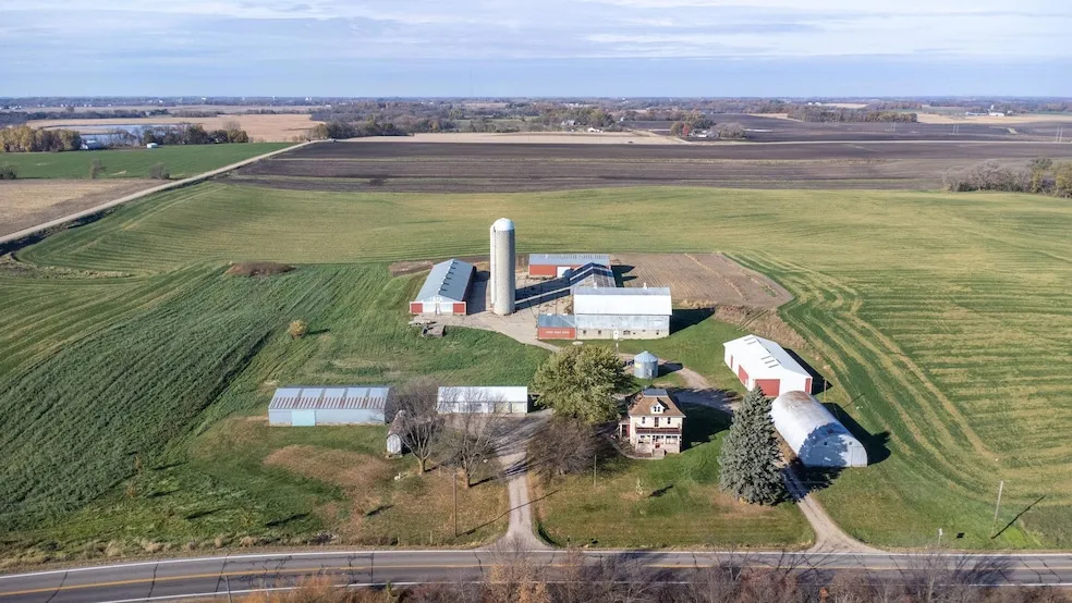 10-acre hobby farm features a beautifully renovated farmhouse and over 30,000 sq. ft. of outbuildings including 9 outbuildings, 3 silos, and a grain bin. The home was renovated down to the studs and now features a custom gourmet kitchen with 40' of quartz countertops, white oak custom cabinetry, farmhouse sink, and pot filler. Refinished hardwood floors, LVP, and new carpet throughout. Updates include plumbing, electrical, spray foam insulation, beams, walls, Pella windows, and mechanicals (furnace, AC, water heater, softener.) Flat house roof and garage roof replaced in 2025. Spacious upper-level bedrooms, including a primary ensuite with walk-in shower and closet. Converted attic loft adds extra living space. See full list of home improvements in supplements. This property has stunning views, modern home updates, an abundance of storage, tillable acreage and room for animals making it perfect for a hobby farm.