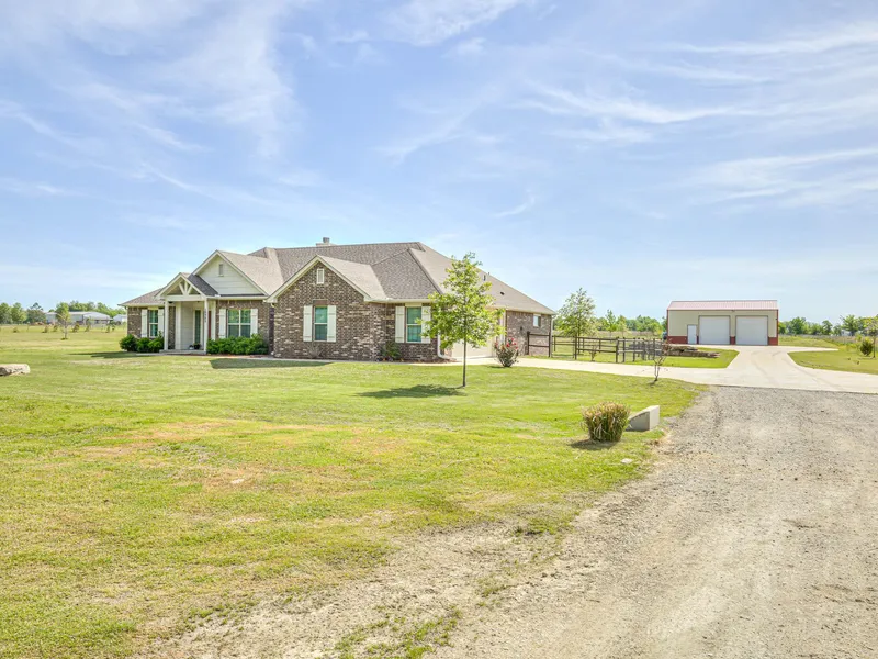 One owner custom-built home with shop nestled on 10 +/- acres just outside of Broken Arrow! Escape the fast-paced city life and retreat to this stunning 3-bedroom, 2-bathroom home built in 2016. The open split floor plan features a spacious living room, dining area, and an eat-in kitchen with built-in benches, perfect for casual dining. The kitchen boasts a large center island with granite countertops, custom-built cabinets, a built-in wine station, stainless steel appliances, and double ovens. The large mudroom, equipped with a utility sink and a dog wash station, is a pet lover's dream. The master suite offers a peaceful retreat with his and her sinks, a soaker tub, a separate shower, and a large walk-in closet. The open concept living room and dining room are great for entertaining, complete with surround sound throughout the home and a floor-to-ceiling brick fireplace. The property features a long circle drive, professional landscaping, and an oversized 2-car garage with extra storage space and a saferoom, providing peace of mind during inclement weather. The 36x30 shop with Wi-Fi, concrete floors, 2 overhead 10-foot electric doors, and a 36x10 lean-to offers plenty of space for all your toys and storage needs. The property also includes a wet-weather creek, a stocked pond, and a fenced-in area for pets, providing ample room for chickens, horses, and a mini-farm, making it ideal for animal lovers. The huge back patio is perfect for outdoor entertaining, complete with surround sound speakers, TV hookups, and a hot tub, offering the perfect space to relax and unwind. Don't miss out on this incredible property, schedule a showing today!