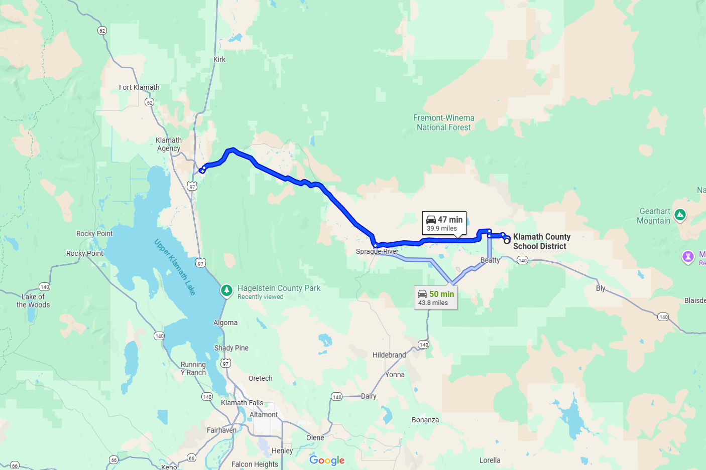 Klamath Falls, OR: ~29 miles larger town with shopping, healthcare, and services