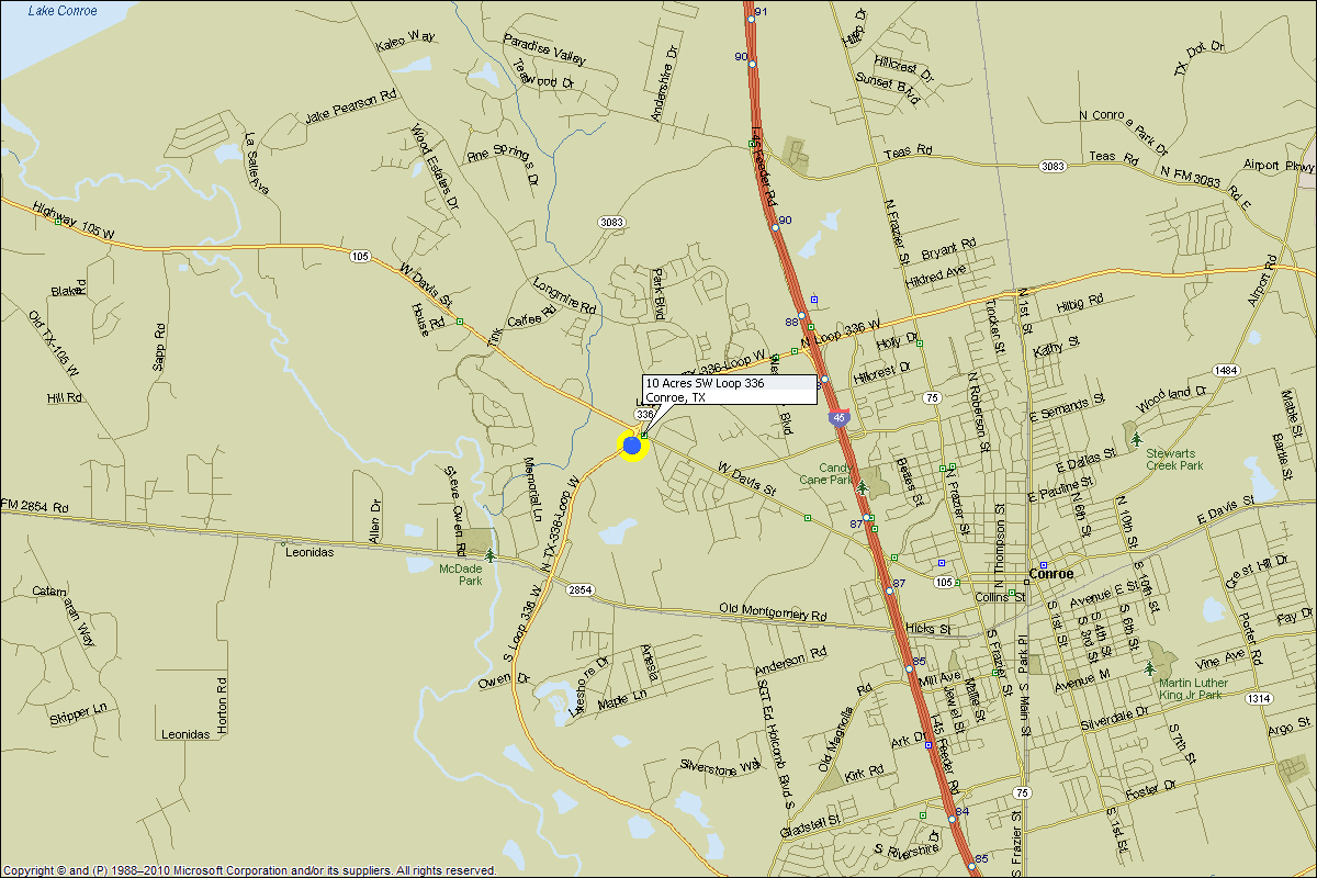 Lake Conroe is located only minutes from the property, "Grand Central Park," Conroe's newest master planned community, is a few miles southeast of the 10.10 acres.. The location of this tract is in the middle of the rapid expansion of Conroe, recently named the fastest growing City in the United States.