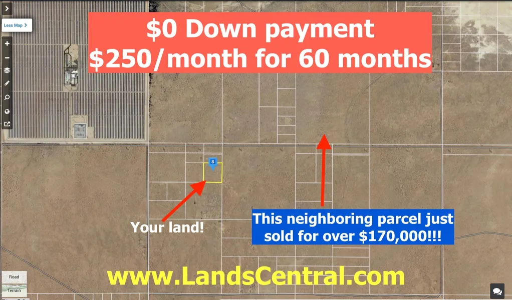 You can type these coordinates in Google Maps to find the land: 34.9930151003993, -117.287293352041