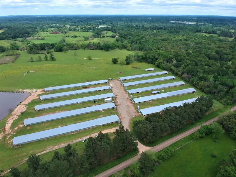 10 house Broiler farm located in Center, TX. This poultry farm consist of 10-40x400 ft. houses, 5 built in 1992, 5 built in 1996. Farm sits on 51.246 acres, has 4 water wells, 2-165 kw generators, 3 incinerators, 2 well houses, 10,000 gallon water storage tank, cake out machine, tiller, wash down rig and equipment shed. Houses have solid side walls, rotem controllers, Cumberland feeders, ziggety drinkers, and quad heaters on natural gas. This farm is currently under contract with Tyson Foods and is growing a 7 week bird with an average of 5 flocks per year.