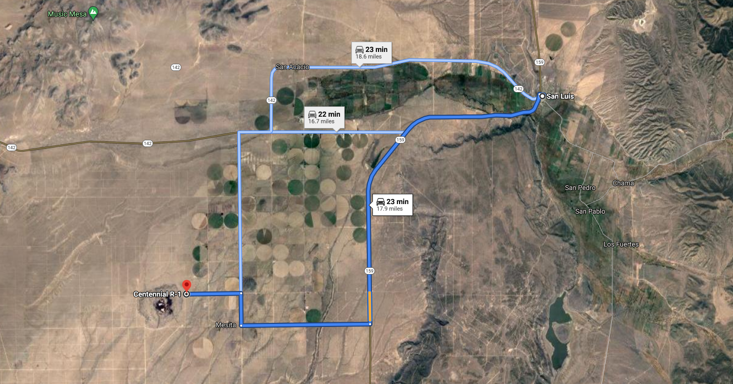 Coordinates: NW corner: 37.1122 N, 105.6240 W (road) NE corner: 37.1122 N, 105.6229 W (road) SW corner: 37.1087 N, 105.6228 W SE corner: 37.1087 N, 105.6240 W
