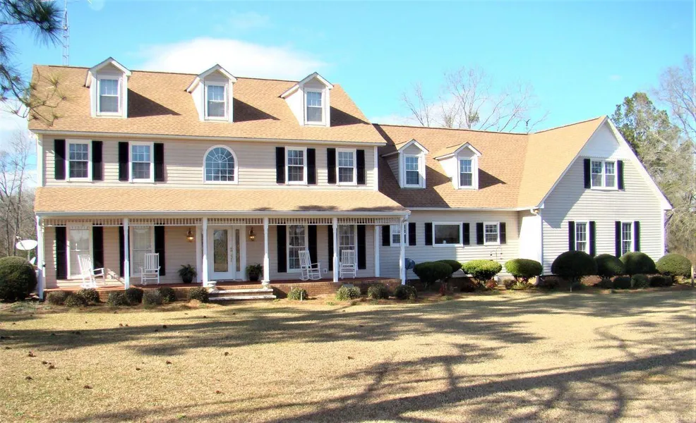 The home is built near the front of the property and has a large, nicely landscaped as well as irrigated yard, with scattered mature hardwoods and pines, and a split rail fence. There is an attractive drive up to the front of the large two-story southern home with a brick stem wall. There are outside security cameras and motion sensors placed for extra security measures.