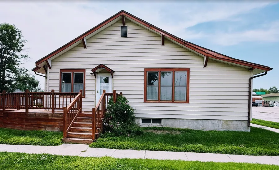 Situated on a spacious L-shaped corner lot, this home welcomes you with a front deck and ramped entrance for easy access. Inside, you'll find fresh updates throughout including flooring, paint, and light fixtures. All finished rooms are on the primary level for convenient living. The backyard extends to the alley behind the garage, offering extra green space and additional parking if you need.