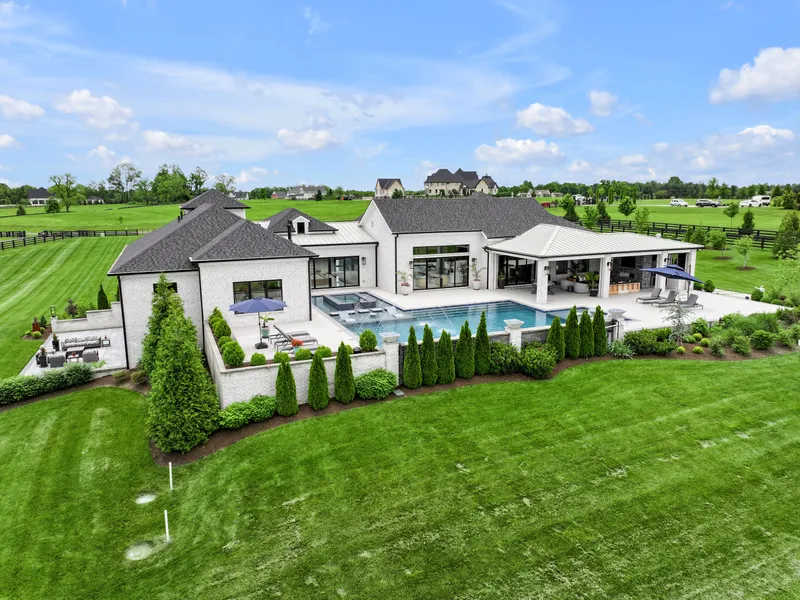 Step into a world of effortless elegance and one-level luxury in this perfectly perfect contemporary retreat. Designed with an entertainer's vision and executed with exquisite taste, this open floor plan home dazzles with white oak flooring, statement glass tiles, sleek porcelains, marbles, and quartz finishes throughout—each room offering its own unexpected delight. The heart of the home is a stunning chef's kitchen that opens seamlessly to expansive living and dining areas, all overlooking six beautifully landscaped acres, a sparkling salt-water pool, and a fully equipped outdoor kitchen and gathering area. The private primary suite is a sanctuary unto itself—featuring a cozy fireplace, poolside access, two large custom closets, a separate sitting room, and a luxurious bath with two water closets and heated floors. 3 additional en-suite bedrooms provide comfort and privacy for guests or family. A hidden study and half bath, custom-crafted white oak staircase, chic wet bar designed for bourbon lovers, butler's pantry, and a stylish lower level rec room with fireplace and full bar complete the interiors. Outdoors, enjoy year-round entertaining surrounded by serene natural beauty!