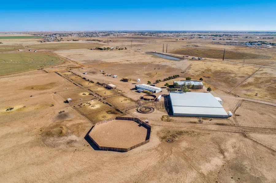95x150 foot indoor insulated arena with living quarters, 31 stalls, automatic waterers, two restrooms, tack room and wash rack. Steel round pen. Wooden pipe round pen 144 foot in diameter. Several feed lot pens, a truck loading shoot and man-made pond. 40x80 foot metal barn with a 1 bedroom, 1 bath apartment. No-climb fences.
