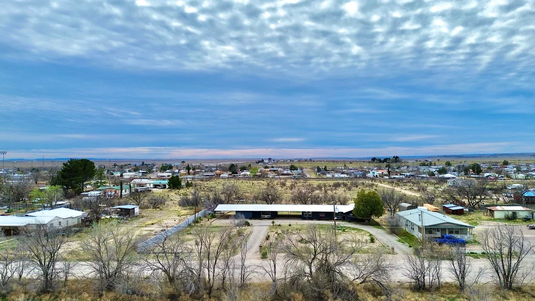 A corrugated metal roof spans the entire home, unifying the structures and offering visual continuity from the east to west ends. To the south of the home the back yard has a raised garden along the east wall, mesquite trees scattered over the gramma grass, and a smaller welded-wire pet yard attached to the adobe home.