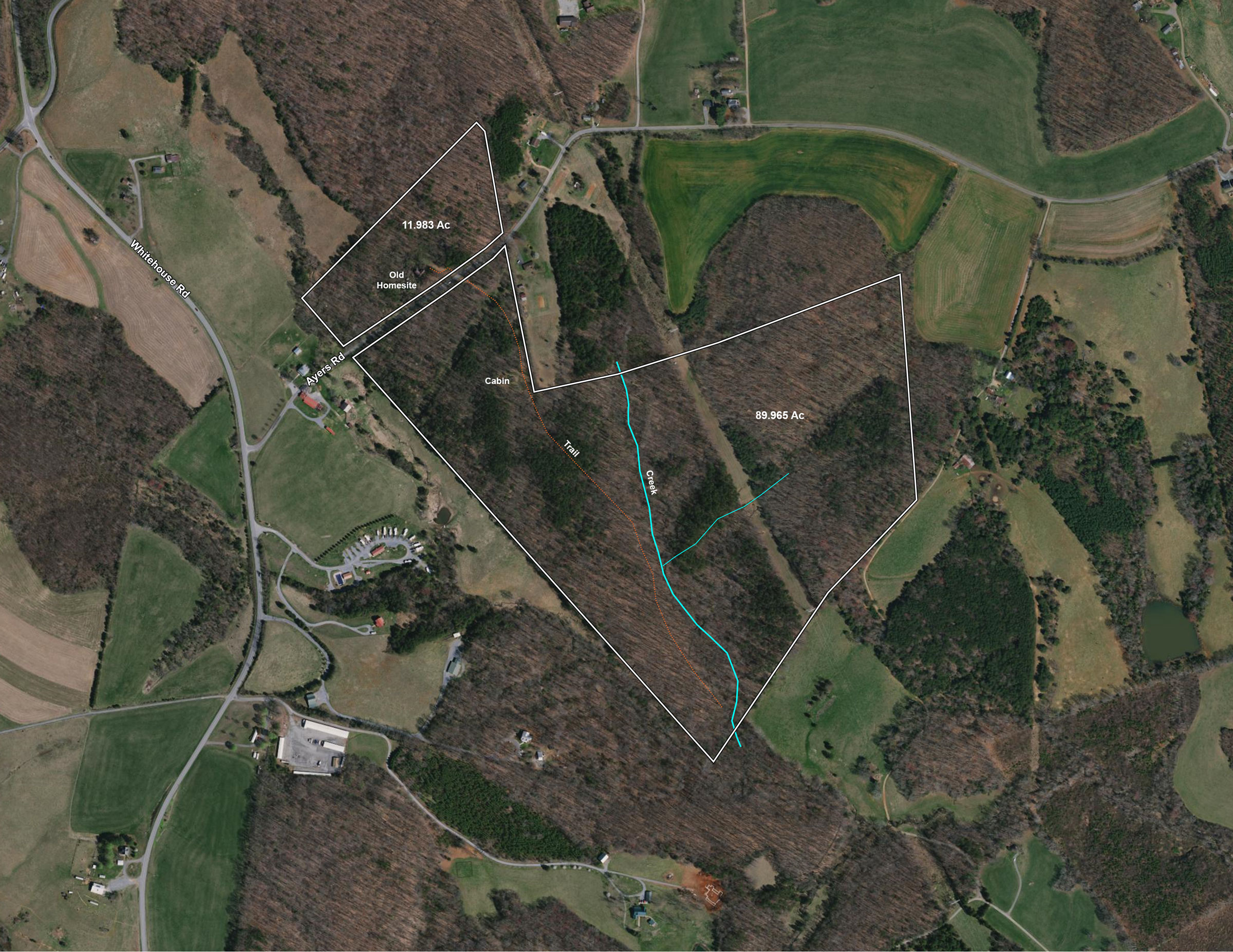 Tract 2: 89.965 acres, more or less, on the south side of Ayers Rd. Nicely wooded with 1,004' of road frontage, hunting cabin, and stream.