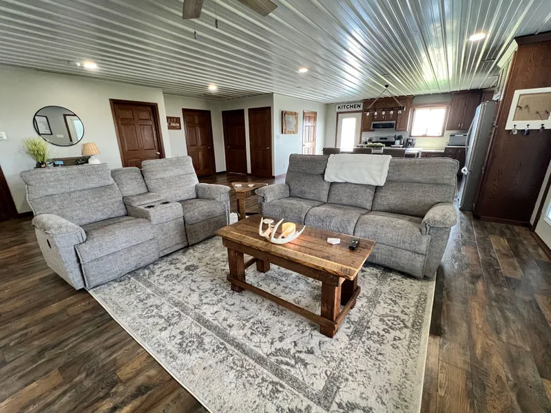 United Country Land Pros is thrilled to present this fully renovated modern ranch-style home, set on 5.7 acres, to the market. This home optimizes its 1440 sq ft of living space with an open concept design that seamlessly transitions into a large kitchen, three bedrooms, a spacious bathroom, and abundant storage. The home comes with all-new GE appliances, installed in 2021, along with a new furnace, central air, septic system, and LP gas fireplace. The kitchen features Amish-built cabinetry, an oversized walk-in pantry, and a large island ideal for meal prep and entertaining.