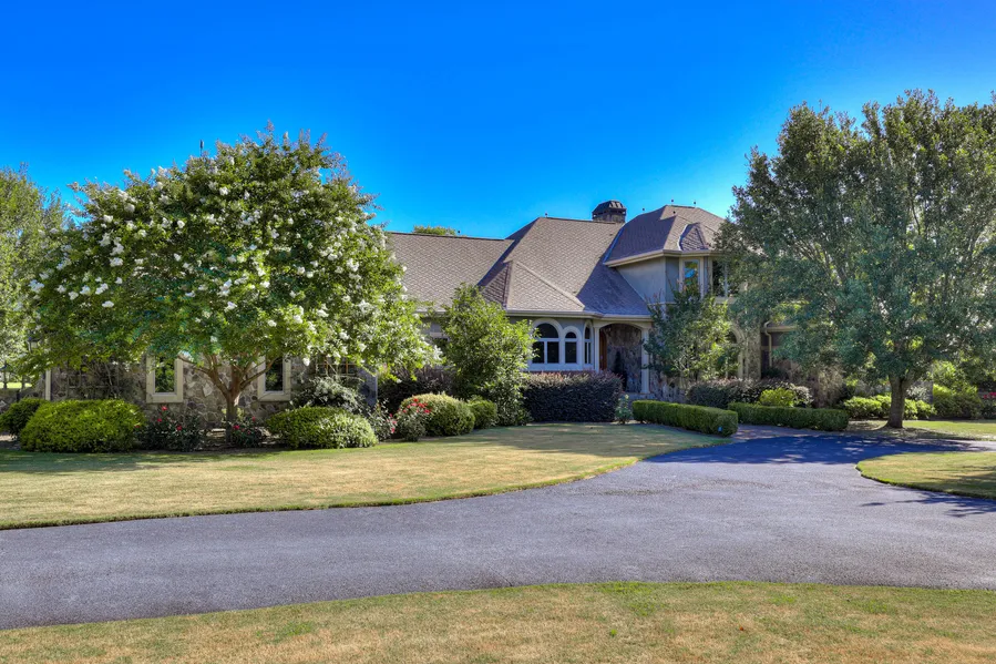 The estate is framed by vibrant crepe myrtles with a magnolia-lined driveway leading to the main residence, Koi House and stables, all showcasing exquisite custom craftsmanship.