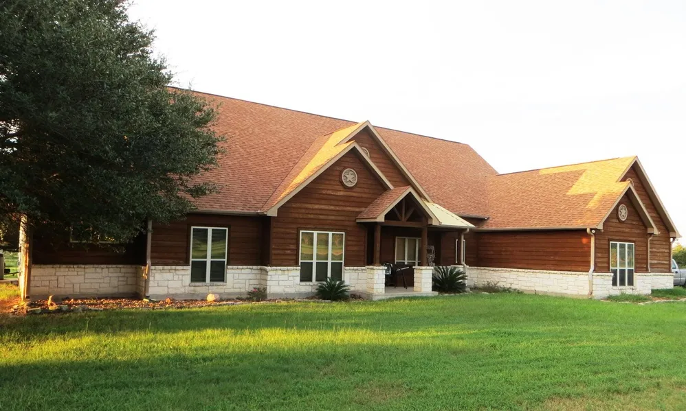 * The exterior of the house includes Austin white stone, cypress siding trimmed with cedar and a composition roof.