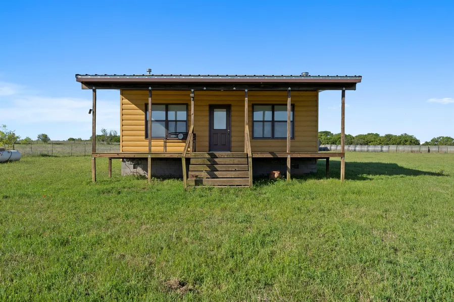 Completely renovated single room, never been lived in open concept cabin has a full kitchen has new appliances, propane cook top, microwave with center island bar seating great for entertaining, with a full bath. The propane cast iron fireplace stove keeps the cabin warm and cozy. The metal shed could be used for storage, farm equipment, livestock stalls, chicken coop to name a few, just use your imagination. The cabin and shed sit on 3 + acres with additional approximately 82 acres and the remaining 8 acres are across the road. The property across the road has a natural spring creek that runs the length of the entire property, magnificent Live Oak, Spanish Oak and Pecan trees scattered throughout the property, thick in some areas. The creek has rock boulders that line the creek in a few places. Property is fenced on three sides, not across the front. Abundant wildlife, a couple of honey bee hives were noticed in the balls of the larger trees. These could be relocated by a professional or set up your own beehives for honey. A trinity water well supplies excellent water to the cabin and the front side pasture. COOP Electricity provides electricity to the well, cattle pens, shed and cabin. Come view today!