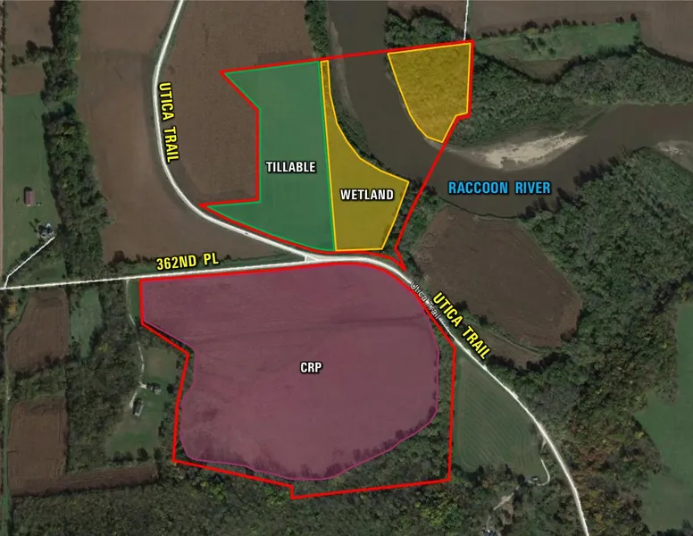 Research Parcel InformationFrom West Des Moines, travel west on Interstate 80 to exit 117 toward Ute Ave / Hwy R22. Turn south onto Ute Ave / Hwy R22 and travel south roughly 3 miles to 360th St / Raccoon River Dr in Booneville. Turn west onto 360th St / Raccoon River Dr and continue 0.35 miles to Utica Ave. Turn south on Utica and continue to 362nd Place. Land is situated on either side of Utica Trail and 362nd Place. Look for Peoples Company signs.