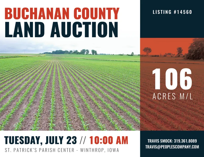 High quality Buchanan County farm to be sold via public auction! Offering 106 acres m/l comprised of nearly 100% tillable land located just east of Winthrop, Iowa in a strong farming area. The auction will take place on Tuesday, July 23rd at 10:00 AM and will be held at St. Patrick's Parish Center in Winthrop.