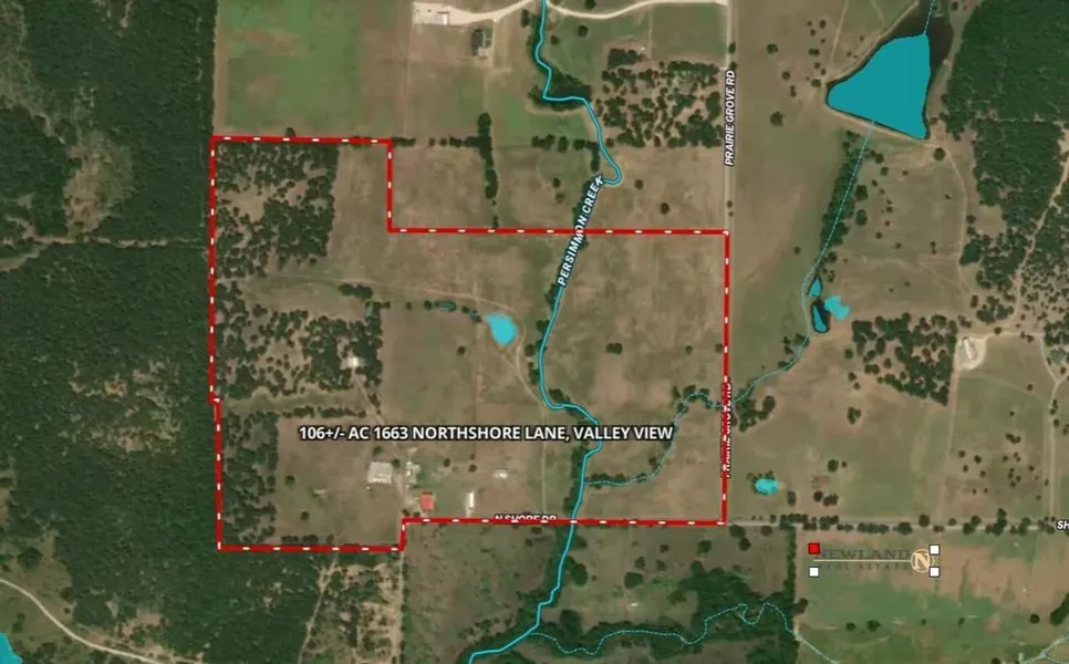 Gorgeous Ranch or Development property located in Cooke County less than ten minutes from I35 and Valley View, five minutes from Lake Ray Roberts and around one hour from the Metroplex and DFW Airport. Approximately 106+/- acres with incredible views, ponds, improved coastal Bermuda, large mature oaks and hardwoods and seventy-five feet of elevation change. Property has over 3,000 feet of road frontage on Northshore Lane and Prairie Grove Road and is fenced and cross fenced. Persimmon Creek also runs through the property and is home to turkey, hogs and deer. Information deemed reliable but not guaranteed.