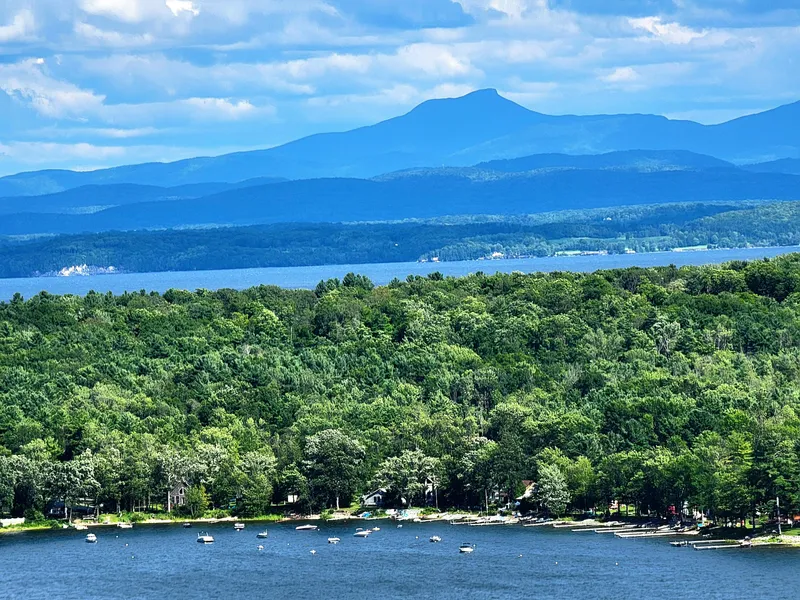 Breathtaking unobstructed 180 degree panoramic views of Lake Champlain and the Green Mountains of Vermont. Sitting on 107+ Acres, the main house has an open floor plan with 2-bedrooms and 2 full baths. Large windows throughout the home draw one's attention to the vistas of the rising sun to the East, sailboats gliding along the shimmering waters, the drama of the setting sun shining on Mt. Mansfield in Vermont, and dark cloudy skies illuminated by the rising moon which casts its silver light upon the waters below. Sit on the huge deck above the waters and listen to the loons sing out as hummingbirds circle the flowers and eagles fish for their meals below. There are two separate guest cottages, snuggled in the hemlocks, for the enjoyment of family and friends. The cabins have generated over $50,000 in annual rental income. Imagine a modern, year round home with the most expansive views o...