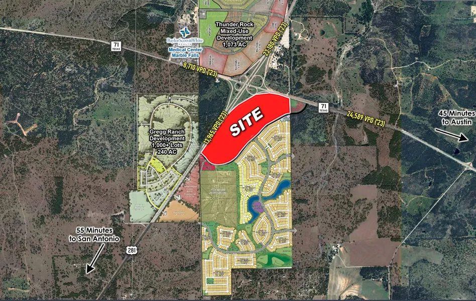 The gateway to the hill country is often called the growing Hill Country village of Marble Falls. It is the go-to 'city' for the resort lake and golfing community of Horseshoe Bay, as well as nearby Spicewood. Marble Falls is on the verge of a development boom. The southeast corner is fully permitted, platted, and ready for development. It’s 50 minutes from Austin-Bergstrom International Airport and 1 hour from San Antonio International Airport, both offering international flights. The private airport at Horseshoe Bay is just 15 minutes from the site.