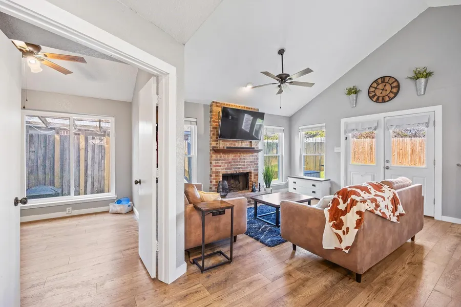 This beautifully updated property boasts an open concept layout with high ceilings & a charming fireplace in the living room. A brand new roof, windows, fresh paint, & new LVP flooring, all the hard work has been done for you. The kitchen features a large picture window overlooking the backyard, perfect for keeping an eye on your loved ones or furry friends. Enjoy the privacy of the spacious outdoor area, ideal for entertaining family & friends. The master suite is complete with high vaulted ceilings, a private door to the patio & a jetted tub for relaxation. The generous 2nd bedroom offers ample closet space, while the 3rd bedroom has been transformed into a versatile space for unwinding & entertaining guests on game day, featuring a wet bar. If desired, it can easily be converted back into a fully functioning bedroom. Conveniently located near schools, easy access for commuting or dining in Fort Worth is a breeze. Don't miss out on the opportunity to make this home yours today!