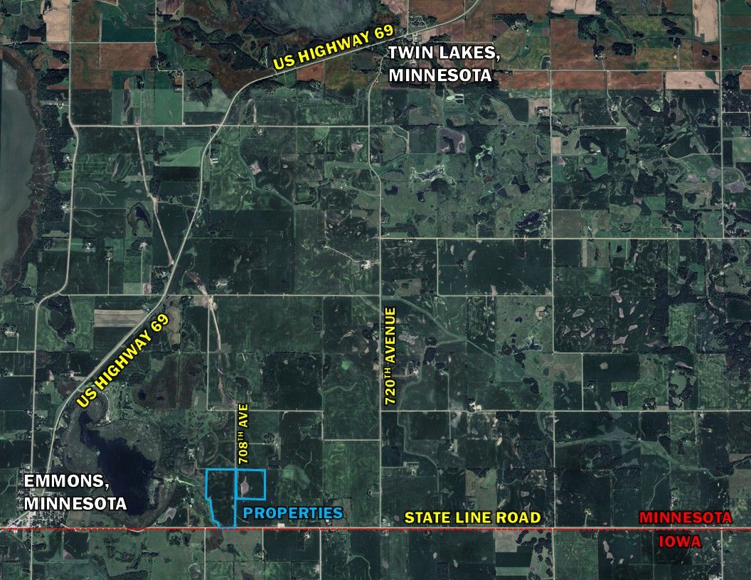 Research Parcel InformationFrom Interstate Highway 35 take Exit 2 for County Rd 5 (125th St) and travel west approximately .02 miles to your first left (south) on County Rd 18 (755th Ave) travel 7.6 miles to State Line Road (Hwy 16), take a right (west) and travel approximately 4.7 miles, Turn right (north) onto 708th Ave and Tract 1 is .03 miles on the right (east) side of the road, Tract two is on the left (west) side as soon as you turn onto 708th Ave. Signs are posted.