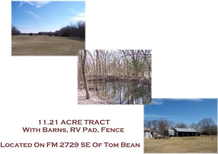 Outstanding 11.21 acre tract of land featuring a perfect blend of open pasture with scattered trees and heavily wooded hilltop. Property features new pipe & cable fencing, 2 old barns with rustic living quarters, RV pad, water and electric meter, creek and small pond. A portion of the property lies within the city limits of Tom Bean.