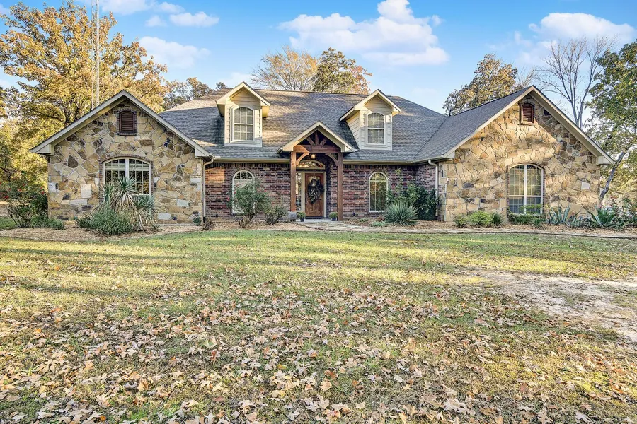 Secluded custom one-owner home sits off the road in a beautiful wooded setting! Gorgeous brick & stone split bedroom floor plan was built in 2008. Open concept in living & dining areas. Stately wood-burning fireplace in living area, plus room has access to covered patio. Elegant wood floors in dining area & office (or 4th bedroom or flex room). Fabulous kitchen has stained concrete floors & granite countertops. The master suite includes a sitting area with access to covered patio. Master bath consists of granite countertops, stained & scored concrete floors, vaulted ceiling, jetted tub, separate shower, & walk-in closet. All on 11 AG exempt acres, 50X30 metal shop, pond, & steps from world-famous Lake Fork!