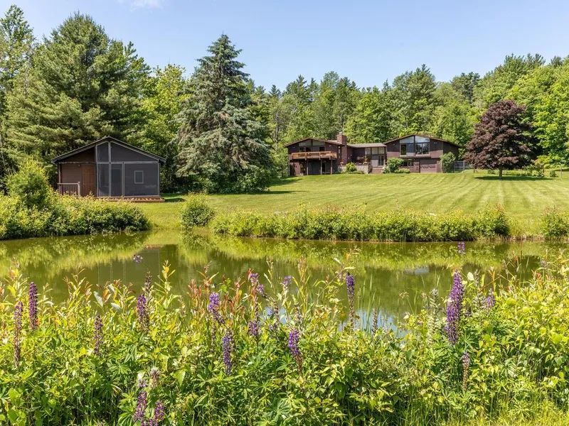 Welcome home to this spectacular 11+ acre property with incredible views of the Green Mountains, meticulously maintained grounds with fenced-in open lawns and fields, plus stunning landscaping. This is a truly special property! Prepare to indulge your green thumb with lovely flower gardens, multiple raised garden beds, and a shed, plus a picturesque pond you can swim in during the summer and skate on in the winter. You won't believe the charming sauna house, complete with a living area and screen porch - amazing! It gets even better when you enter the California deck house and appreciate the very cool architecture with vaulted cedar ceilings, mahogany trim, and mahogany spiral staircase. Large foyer with beautiful blue stone flooring and floor-to-ceiling windows that open to a fabulous back patio overlooking the pond and Mt. Mansfield. To the left of the foyer, you'll find the bedrooms, an office, and tons of storage. To the right, you'll enjoy the spacious kitchen with loads of natural light, plus a large open dining and living area that includes a gas fireplace and balcony, plus lower level walkout family room with wood burning fireplace. Expansive primary suite with mountain views, a 3/4 bath, and oversized walk-in closet. Garage bays on both sides of the home for easy parking and mower storage. Pride of ownership shows throughout this home, so don't miss the chance to own this extraordinary property that blends natural beauty and architectural charm.