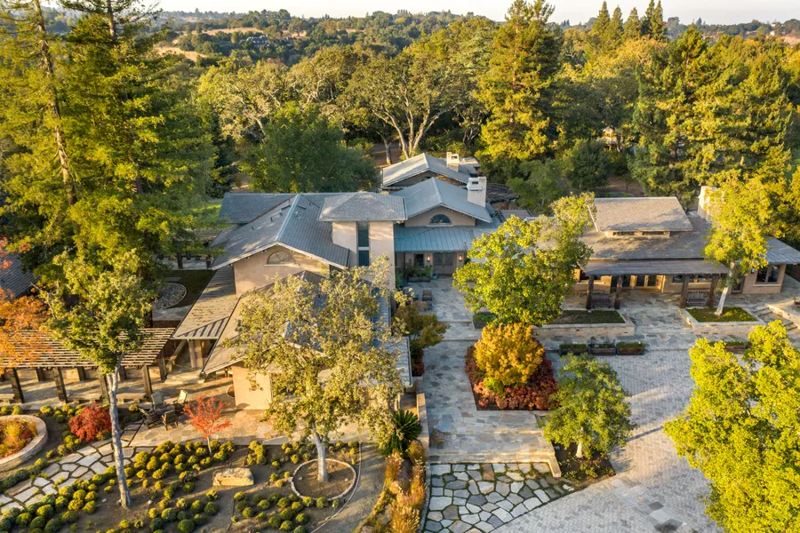 The most awe-inspiring compound in Silicon Valley is located on three knoll top level parcels totaling over 11 acres with commanding views of the Santa Cruz Mountain range and the 272-acre Horse Park at Woodside. Less than a mile away is the town center and iconic Sand Hill Road. This compound with a rich history features two main residences, three guest homes, a tennis pavilion, a strikingly handsome multi-purpose, finished barn converted to a ballroom or meeting facility, several garages, soccer field, tennis court, oversized pool, a kids playground fort, manicured grounds and much more. It is all surrounded by native specimen trees, meandering paths, and several private drives. The centerpiece of this first ever offering is the twenty-first century version of the Bernard Maybeck original that was built on this site 100 years ago. Built in 2012, it is a craftsman design like no other. Breathtaking architecture has a live in sculpture feel with a timeless elegance that will be admired for generations. The home is a quintessential California indoor-outdoor configuration with walk-out doors/windows on all four sides that lead to the multitude of verandas supported by impressive rough cut timber columns that create luxurious and comforting exterior living areas. The second main house has been beautifully updated with over 5100 sq. ft. of living space, five bedrooms, five baths, beamed ceilings, embellished millwork, a private office and a light filled three car garages befitting an artist studio, an oversized covered and heated pool, all overlooking Silicon Valleys premier equestrian facility.
