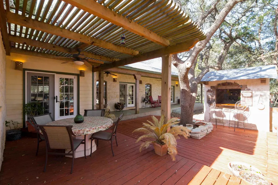 Looking for a beautiful, secluded private sanctuary on a private road? Want your own bluebonnet and wildflower field in the spring? This property abounds in large mature oaks providing wonderful shade all around the home allowing for a cool breeze. This e bedroom, 4 bath home has many unique features displaying great personality! It can be considered a 2 family home or in-law-outlaw accommonodations including TWO kitchens. The huge outdoor living space is used 9 months of the year. It includes a 50' covered porch, pergola over the dining area and a cantina for entertaining.