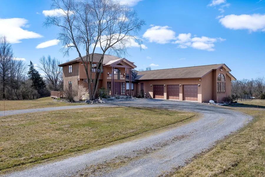 A setting of 11.8 acres, surrounded only by well-tended farmland and grazing sheep, makes this custom contemporary feel even more unexpected and dramatic when it finally comes into view at the end of a long driveway. A handsome double entry and three new high-quality garage doors are welcoming to guests and homeowners alike. Inside, soaring wood ceilings and expansive windows are highlights of the home’s one-of-a-kind design. Gathering spaces are distinct, yet maintain an open feel, with the living and family rooms flowing out to a large, sunny deck. The kitchen is sure to please cooks of every level with appliances by Bosch and Thermador, ample granite counter space at the island and plenty of storage in double pantries. Fresh paint in warm white continues into the private areas, including the first floor main suite offering a deep walk-in closet and peaceful views from a sun-soaked tub. A hall bath serves an office and another versatile first floor bedroom. Upstairs, 2 bedrooms with durable laminate flooring share a bathroom and the ultimate hangout loft. A fenced garden, a pet run and a massive basement let you pursue hobbies and store all the gear they require. With a generator, efficient 2-zone heating and a water treatment system, comfortable living is never in question.