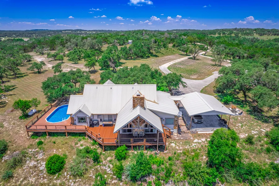 This custom-built home offers amazing views and endless amenities, all situated on an expansive 11.87-acre lot. The main home boasts 4 bedrooms and 2 baths, plus there's a 720 SF. guest house located next to the 1,008 SF shop and carport. As you drive up the private, gated driveway, you'll be greeted by the stunning panoramic views from the hilltop location. The spacious living area features soaring ceilings, a cozy fireplace, and stained concrete flooring throughout, providing both comfort and style. The island kitchen is a chef's paradise, complete with granite countertops, custom cabinets, and ample space for meal prep and family gatherings. The flexible floor plan includes a bedroom that has been converted into an office, another used as a hobby room, a welcoming guest room, and a luxurious primary suite. Both bathrooms are elegantly designed with antique cabinets and fixtures, adding a touch of timeless charm. Enjoy outdoor living at its finest with a 1/4 acre stock tank and an above-ground salt water pool featuring custom decking. The sprinkler system ensures the lush landscape stays green and healthy year-round. This property is ag exempt and includes a workshop guest house, making it ideal for hobbies, storage, or additional living space. Combining luxury, functionality, and stunning natural beauty, this unique property provides everything you need and more. Don't miss your chance to make this exceptional home yours!