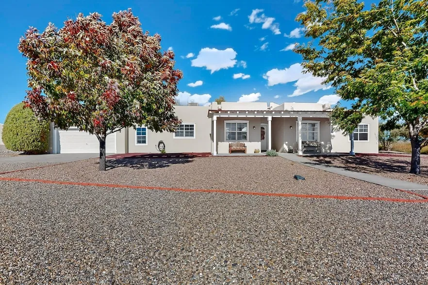 Postcard Sunsets/Sunrises from this adorable 11.94 acres property. This ranch-style home welcomes you into a large entry with open windows and amazing views of the Santa Fe mountains. West end of the home offers a spacious kitchen with plenty of cabinets that opens into the large living room. A separate laundry room, a bonus room (for pantry/as exercise room), and two car garage also at west end. To East end, spacious primary bedroom and bath, two large guest rooms, and a second full bath can be found. A Few feet from the house a large custom 1449 sqft garage, storage, and workshop space with vaulted ceilings, windows, garage doors, and covered patio can be found. Gated community is horse friendly with 50-acre open space for residents. Minutes from dining, shopping, airport. A must see!
