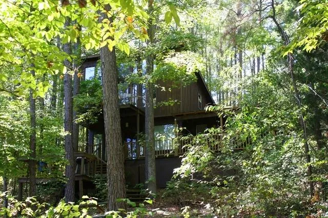 Your very own tree house. Well not exactly but maybe even better. This rustic home is quietly tucked away in the trees offering the perfect get away for the person who wants to enjoy peace and quiet. It is constructed out of rough cedar which fits in perfectly with its surroundings. Sitting up high you look out through full length windows and all you see are trees, your own private lake and over 11 acres. The home has been recently updated with stainless steel appliances, laminate flooring and new carpet. The master bedroom has its own parade balcony and an absolute stunning view. There is a huge deck off of the main living and kitchen area looking out at the lake. You have a hiking trail that will take you almost all the way around the lake. The living area has vaulted ceilings and tons of glass that not only keeps this area bright and airy but allows you to figure out which season is truly the best. For cold winter nights, you have a great wood burning fireplace. There is a great outbuilding that could easily be used as an art studio or possible converted into a guest house. Dont sit around thinking about this property. If you do, you may end up never getting to see it.