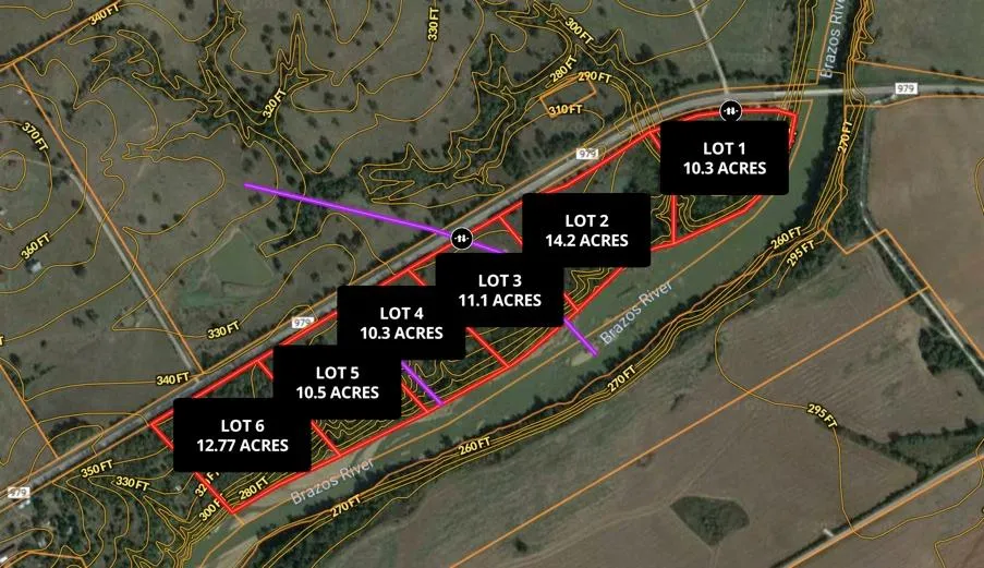 A truly unique offering of small acreage on the Brazos River. This beautiful stretch of river, known as Curly Shoals, is more like a scene from the Hill Country. With shallow rapids, huge boulders, sand/gravel bars, and deeper holes for fishing, it has it all! This recreational paradise is loaded with deer, hogs, and even a Bald Eagle nest high up in a Cottonwood Tree. Centrally located in the heart of the Texas Triangle only 35 miles from Bryan/College Station, 60 miles from Waco, 90 miles from Austin, and 120 miles from Houston. Each lot has considerable paved frontage on FM 979. Tracts 1 and 6 are sold. Call/text Landon Allen at (903) 875-9798 with questions or to set up a showing.