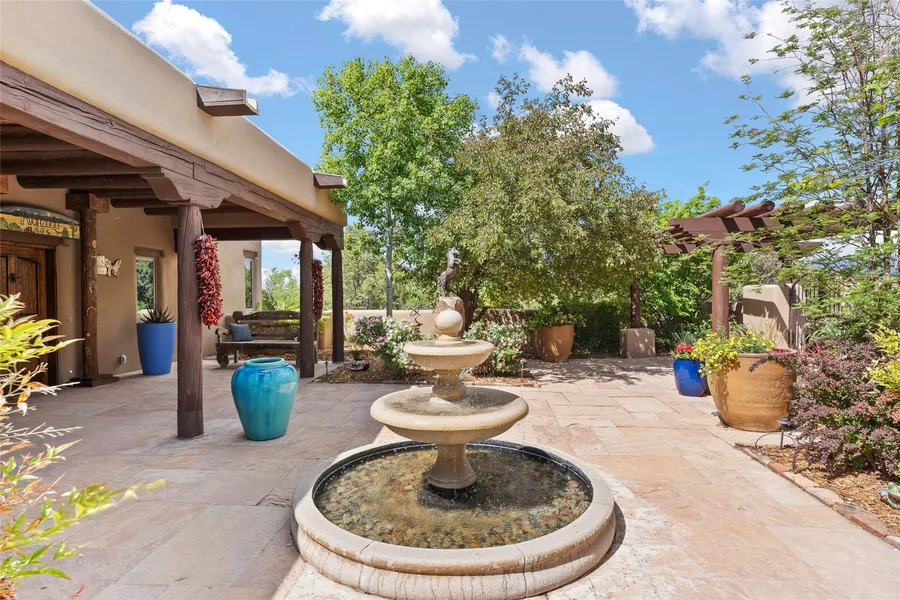 For those seeking the best of Santa Fe, this elegant and classic property delivers. A newly installed roof with a 10-year transferable warranty adds peace of mind to this exceptional home. Set on 2.26 acres in Las Campanas, this approximately 5,600 square foot residence (inclusive of the casita) is a feast for the senses and a joy for day-to-day living and gracious entertaining. The high quality of the property is evident in every aspect. The 3-bedroom main residence, the beautifully appointed studio casita, and the masterfully conceived and executed outdoor areas come together to make this a very special property. The home is constructed with pumice-crete, a material known for excellent temperature insulation, natural flame resistance, and effective sound dampening. The kitchen serves as a warm and welcoming focal point, while the main living areas (living room, dining room & den) all provide beautiful views of the inspiring sunsets and Jemez Mountains. In addition to the very dramatic walled and gated entry courtyard and the other small and inviting private courtyards, the main western portal is one of the most appealing outdoor living/entertaining spaces in all of Santa Fe. Radiant heat, air conditioning, and the three vehicle garage are other details that make this property an ideal primary residence or vacation home. Located in Santa Fe's premier club community, the membership to the Club at Las Campanas is at the discretion of the new owners. A dozen minutes to town or quick access to the many amenities of the club, this property allows for the ultimate in Santa Fe living.