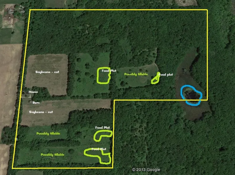 110 acres of phenomenal whitetail deer and turkey habitat. There are 50-60 acres of mature hardwoods that surround five separate fields, of which two are currently being farmed, but all 5 could be if wanted.