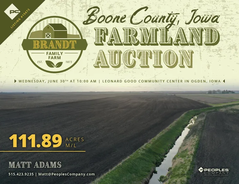 Boone County, Iowa Farmland Auction Mark your calendar for Wednesday, June 30th! Peoples Company is pleased to be representing the Estate of Donald I. Brandt in the sale of 111.89 total acres m/l located in northwest Boone County between the towns of Boxholm and Pilot Mound. This farm has been a long-time family heirloom of the Brandt family. Originally homesteaded in 1873, this property will be made available for sale to the public after 148 years of family ownership.