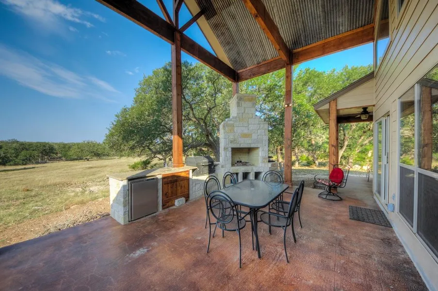 The ranchs home is a newly constructed 1,600+/- square foot, two-story home. Built with a split 2 bedroom and 2 bathroom, open floor plan, with a bunk-style loft, the home has quality finishes: limestone exterior, high ceilings, concrete floors, granite counters, and wood and metal finishes that give it a rustic feel. Large windows offer long-range views of the property from both upstairs and below. A large covered patio hosts an outdoor kitchen and fireplace area that enjoy the same views of the ranch.