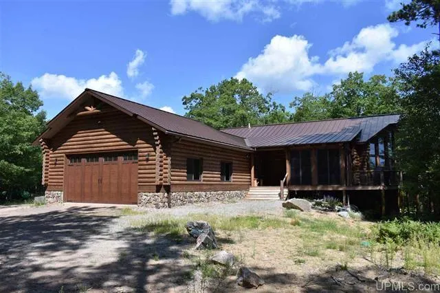 A dream property awaits you here in Northern Marquette County. 40 acres of high rolling terrain that sits atop a ridge line with Lake Superior views sets the scene for a gorgeous, modern log home. Wonderful attention to detail throughout this home provides a move in ready opportunity. The access to the property is via a private easement road about 1/4 mile from the year round County Road KR. Underground power and wifi internet make this location connected but you'd never know that sitting on the deck overlooking the mature oak, pine, and hemlock forest with distant views of Lake Superior. It's hard to cover all the great features in a description and limited pictures, so be sure to view the virtual tour and drone footage. The home's main level features a large attached garage, covered entryway, screened in room attached to the dining room and deck, a bath with laundry, hard tile flooring...
