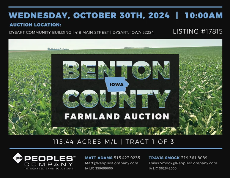 Research Parcel InformationFrom Dysart, Iowa: Travel north out of town on State Highway 21 for 0.5 mile to State Highway 8. Turn east onto State Highway 8 and continue for 1 mile to 11th Avenue. Head north onto 11th Avenue and travel for 4.25 miles. The farm will be located on the east side of the road. Look for Peoples Company signage.