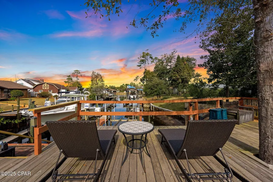 Welcome to 115 Greenwood Drive, Panama City Beach, FL--a waterfront haven nestled on a spacious corner lot in highly desired Woodlawn Estates, just minutes from NSA Panama City (Naval Base)! This stunning property boasts direct canal access, complete with a dock equipped with electrical and water, two boat slips, and two lifts (6,000 lbs. and 12,000 lbs.)--making it a boater's dream with quick access to the Bay and Gulf. Step off the dock, and the outdoor space is an angler's paradise, featuring a privacy-fenced yard, outdoor shower, fish-cleaning station, grilling area, storage shed, and an open patio perfect for enjoying serene waterfront views. Relax on the deck overlooking the canal, where you might spot dolphins, fish, otters, and other wildlife. Inside, this home offers a spacious layout designed for both comfort and entertaining. The open kitchen features quartz countertops, ample wooden cabinetry, a walk-in pantry, stainless steel appliances--including a GE double oven with an air fryer--and a breakfast bar overlooking the welcoming living room with a wood-burning fireplace. A formal dining area and a separate formal living room provide versatile spaces for hosting family and friends. Please note: The chandelier in the dining area (pictured) is a family heirloom and will not be included in the sale. The generously sized bedrooms and bathrooms have all been updated in recent years, ensuring modern comfort and style throughout. Luxury vinyl plank flooring flows seamlessly through the home, complementing the spacious design. Additional highlights include a large laundry room with built-in cabinets, a 2-car garage with extra storage space, and the peace of mind that comes with FEMA map overlay showing Flood Zone X. The property also features a sprinkler system on a well and a water softener system, adding convenience and efficiency to the home. This home is a gem you don't want to miss!