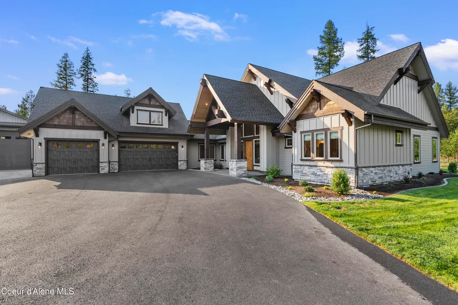 Welcome to a North Idaho estate with rustic charm. This custom built 3,409 sq. ft. residence by an award winning local builder is perfectly set on 5.08 wooded acres, offering the rare combination of seclusion, luxury, and convenience. Located just minutes from Hayden, Coeur d'Alene, and Rathdrum. From the moment you arrive, the timbered entry creates a striking first impression. Step inside to a grand entryway and living room with vaulted ceilings and exposed cedar timbers, where walls of windows frame the surrounding forest and invite abundant natural light. The heart of the home is a chef-inspired kitchen designed for entertaining. Featuring custom knotty alder cabinetry, quartz countertops, Thermador appliances, a double oven, a separate 34-inch refrigerator and a 34-inch freezer, dual dishwashers, a butler's pantry, and an oversized island, it balances functionality with elegant design. The primary suite is a true retreat, boasting a spa-like bathroom with an oversized shower featuring three shower heads, a soaking tub, and refined finishes that bring comfort and sophistication to your daily routine. Relax and unwind in the great room or on the timbered back patio, where you can watch turkey, deer, elk, and even moose roam across the property. The home offers 3 bedrooms, 3.5 bathrooms, 10-foot ceilings, and 8' solid core doors, with thoughtful touches throughout. Outdoors, the grounds are fully landscaped with an automatic sprinkler system and a paved driveway leading to a 3 car garage of over 1,000 sq. ft. For hobbies, storage, or adventure vehicles, the estate also includes a 40' x 52' insulated shop with dual 14' doors, a dream setup for RVs or boats. A seamless blend of comfort, craftsmanship, and natural beauty, this home is more than a residence, it is North Idaho living at its finest.