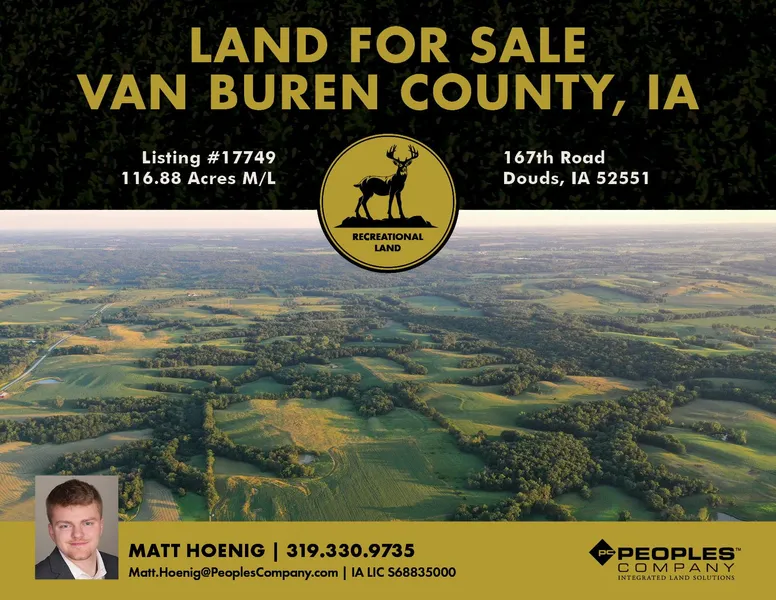 Peoples Company is pleased to present an excellent opportunity to own 116.88 acres m/l of income-producing recreational land in Van Buren County, IA. Located just under 5 miles from Selma, IA, this farm is situated in the heart of trophy-class Whitetail Deer territory. These 116.88 acres m/l offer a perfect balance of timber, CRP, and row crop acres, ensuring solid income without sacrificing recreational opportunities.