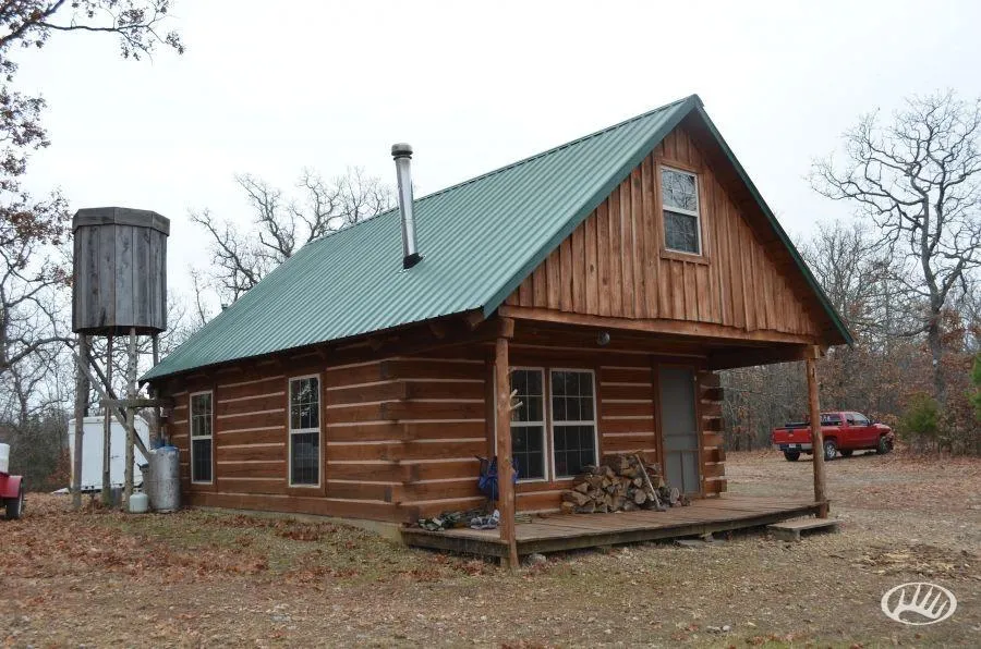 - The cabin has approximately 700 sq. ft. finished (including the upstairs loft) and has a nice front porch for hanging out. It has water with 1250 gallons of water storage, septic system, propane heat and lighting and a wood burning stove