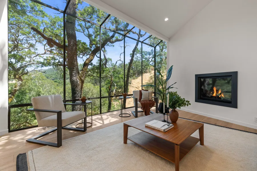 Located in The Ranch, eastside Sonoma's premier, gated community above the Plaza. Originally designed by Robert Zinkhan, this timeless Modern home has been dramatically renovated and a pool added. Custom split-level floor plan with high ceilings throughout offers natural views from 2,818± sq. ft. with 3 bedrooms and 2.5 bath. Luminosity and nature are brought indoors with floor to ceiling atrium style windows in the living room and new Milgard large, picture windows throughout. Resting upon 5.81± acres, the setting is serene and private. No detail was left undone with fresh European White Oak engineered hardwood floors, recessed lighting, built-in closet shelving and Tufted Wool carpet. Prep and entertain at the large Cherry wood island with sleek lines that complement the entire home's design. Decked out with Calacatta marble counters, plentiful custom WoodTouch cabinetry, open shelving and Thermador stainless steel appliances. The primary suite wing affords idyllic views of natural flora and trees from huge windows that bring the outdoors in and an attached, fully-windowed bonus room with private view deck. Guest wing has 2 bedrooms with gorgeous outlooks, full tiled bathroom, additional media room, an office, a spacious laundry room and a half bath. Only 1± hour to San Francisco.