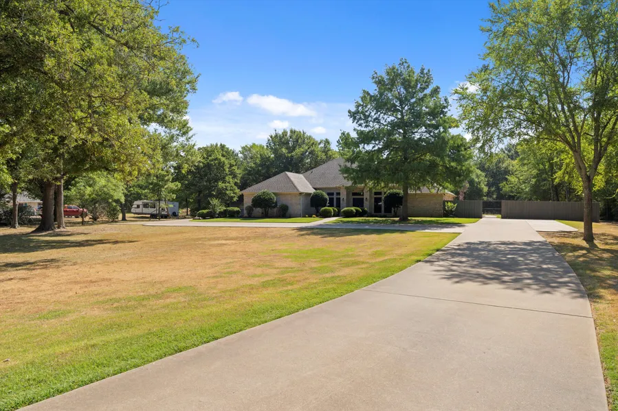 Custom home on 2+ acres located in private subdivision. This 3 bedroom, 2 bath home nestled among mature trees at the end of a quiet cul-de-sac offers open concept living area with high ceilings and windows which provide a picturesque view of backyard. The spacious master suite features built-in cabinetry, large en suite bathroom, jetted garden tub with separate shower, and a 10 x 14 walk-in closet with built-ins for organized storage. The 2 secondary bedroom are generous sizes. The backyard has a gorgeous in-ground heated pool, built-in water with rock waterfall, custom hot tub, and beach entry. Other features: gas log fireplace, granite counters, and fantastic scored concrete floors throughout the home. Oversized attached 2-car garage with storage closets, and attic access. Detached workshop on slab foundation is plumbed and insulated with AC for projects and more storage. Sprinkler sy...