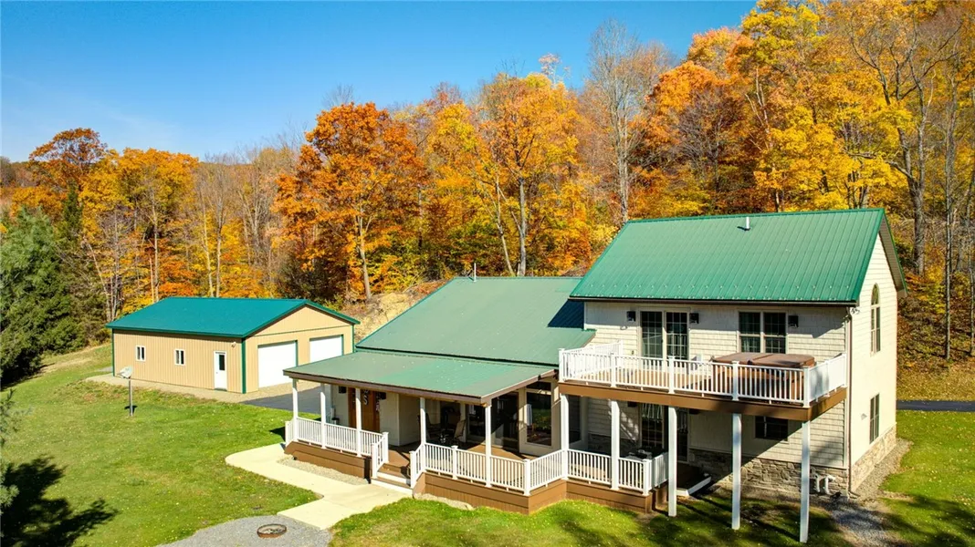 QUALITY ABOUNDS THIS SECLUDED COUNTRY HOME ON 5.7 ACRES IN THE HEART OF THE ALLEGHENY NATIONAL FOREST! Unique opportunity to own this home with open floor plan and a master suite loft. Enter the spacious foyer from the large covered front porch. This entry leads to a bedroom and a full bath. Then opens to the gorgeous and spacious open floor plan with living room, dining and kitchen. The living room offers HW floor, stone WBFP and more. The dining room with ceramic tile floor opens to the covered porch through sliding doors for added entertainment space. Boasting rights come with this beautiful kitchen that offers all the features that today's buyer is looking for. Wind up the spiral staircase to the stunning master bedroom suite. Step out the sliding door to the large balcony with a hot tub. The owner did not miss anything when adding a 22 x 28 metal garage to the already 24 x 24 garage. Blacktop driveway leads you to this private setting. Located minutes to the NYS Allegany State Park. Must be Pre Approved when scheduling showings on this property.