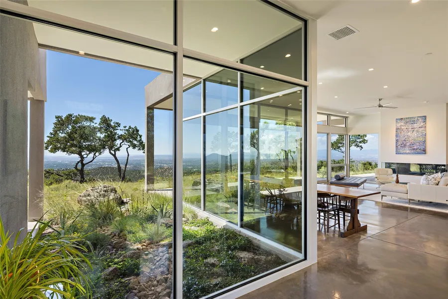 On an elevated perch in the gated High Summit community, this exceptional Santa Fe home built by Tierra Concepts in 2018 epitomizes sophisticated, luxurious living and offers perhaps the most breathtaking views in the city. A contemporary gem on a 1.27-acre lot, it boasts 3,070 square feet of living space, three bedrooms, a sitting area, three baths, and a harmonious blend of modern design, unparalleled comfort, and effortless practicality. The single-level open floor plan showcases abundant glass and windows that capture panoramic vistas of Santa Fe, Los Alamos, Albuquerque, and the Santa Fe ski area. Elegant concrete and tile floors exude modern charm. Beneath 11-foot ceilings in the living room, a DaVinci fireplace creates an inviting ambience, and the chef's kitchen is equipped with Wolf and Sub-Zero appliances. Other highlights include motorized blinds and shades, six-zone radiant i...