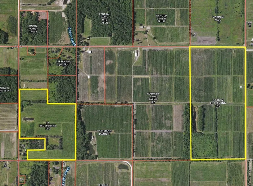 This offering consists of two parcels in close proximity to one another. Together, the properties comprise over 118 (+/-) acres, with 76 (+/-) of blueberry acreage. Solid set irrigation provides water, with Blue Crop, Jersey, Rubels, and other varieties. Two ponds, a 40X40 outbuilding and a mobile home is included in the offering. Production data is available upon request. Offering could be combined with neighboring 99 acre farmland listed.